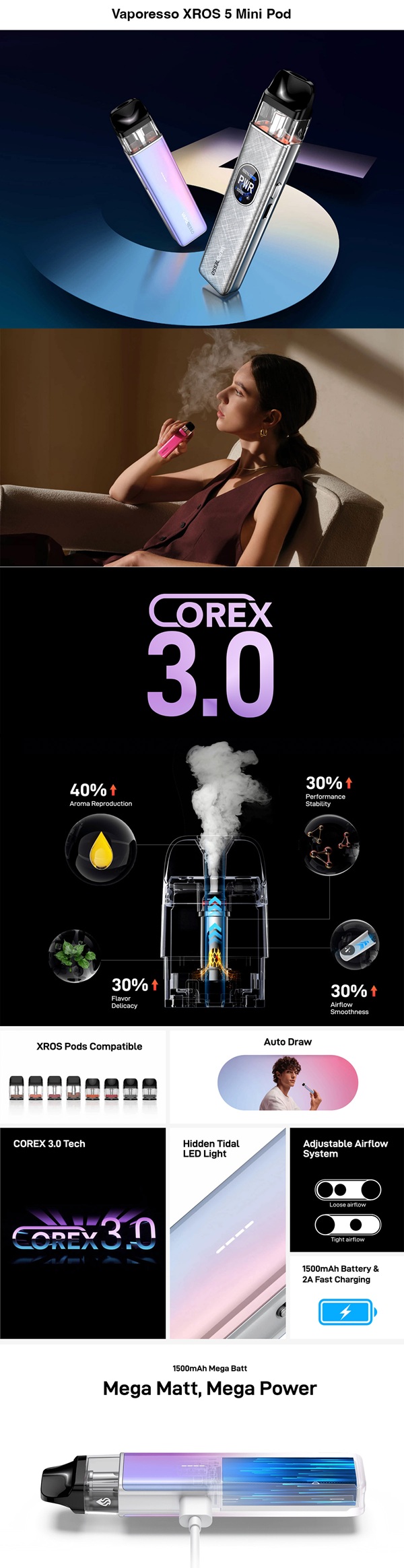 O Vaporesso XROS 5 Mini Pod System é uma variante compacta do XROS 5, ideal para usuários que buscam desempenho excepcional em um formato mais portátil. Este modelo também utiliza a tecnologia COREX 3.0 para proporcionar uma reprodução de aroma mais rica, sabor delicado e uma experiência de vaporização mais suave — tudo isso com uma bateria de 1500mAh e controle de fluxo de ar ajustável. A principal diferença é que o XROS 5 Mini não possui a grande tela HD de 0,88 polegadas encontrada no XROS 5 padrão, tornando-o ainda mais compacto e fácil de transportar no bolso. Ele ainda suporta carregamento rápido de 3A, garantindo que você possa recarregar rapidamente e voltar a desfrutar da sua vaporização.