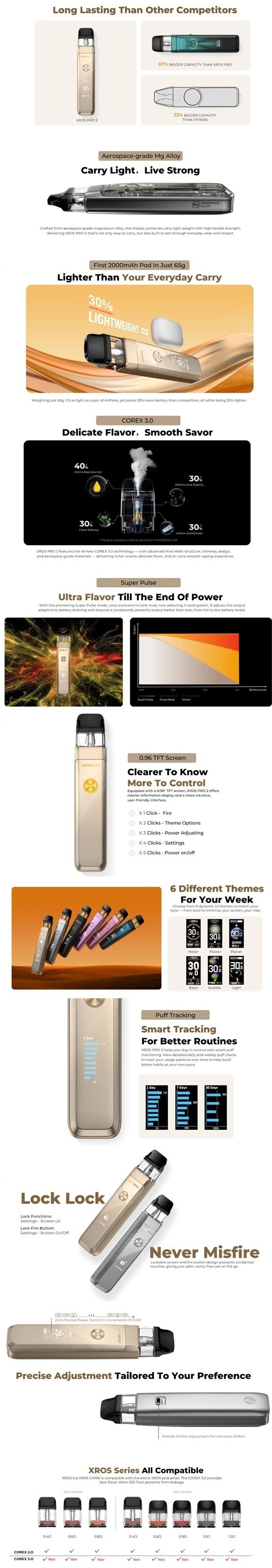 O Vaporesso XROS PRO 2 redefine a experiência premium de vaporização MTL com um equilíbrio incomparável entre potência, portabilidade e sabor. Com uma bateria robusta de 2000mAh em um corpo ultraleve de liga de magnésio de grau aeroespacial com apenas 65g, ele oferece até 67% mais capacidade do que o XROS original e 33% mais do que os principais concorrentes — tudo isso sendo 30% mais leve.